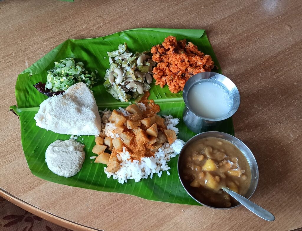 Meals are traditionally eaten on large plates called Thali. In Indian household meals are either eaten seated on the floor, or on very low stools or cushions. Indians use their hand rather than cutlery to eat their meals. In Southern India, cleaned banana leaves are used to serve the food. When hot food is served on the banana leaf it releases certain antioxidants which has a large number of health benefits for the human body. Banana leaves are also used on special occasions